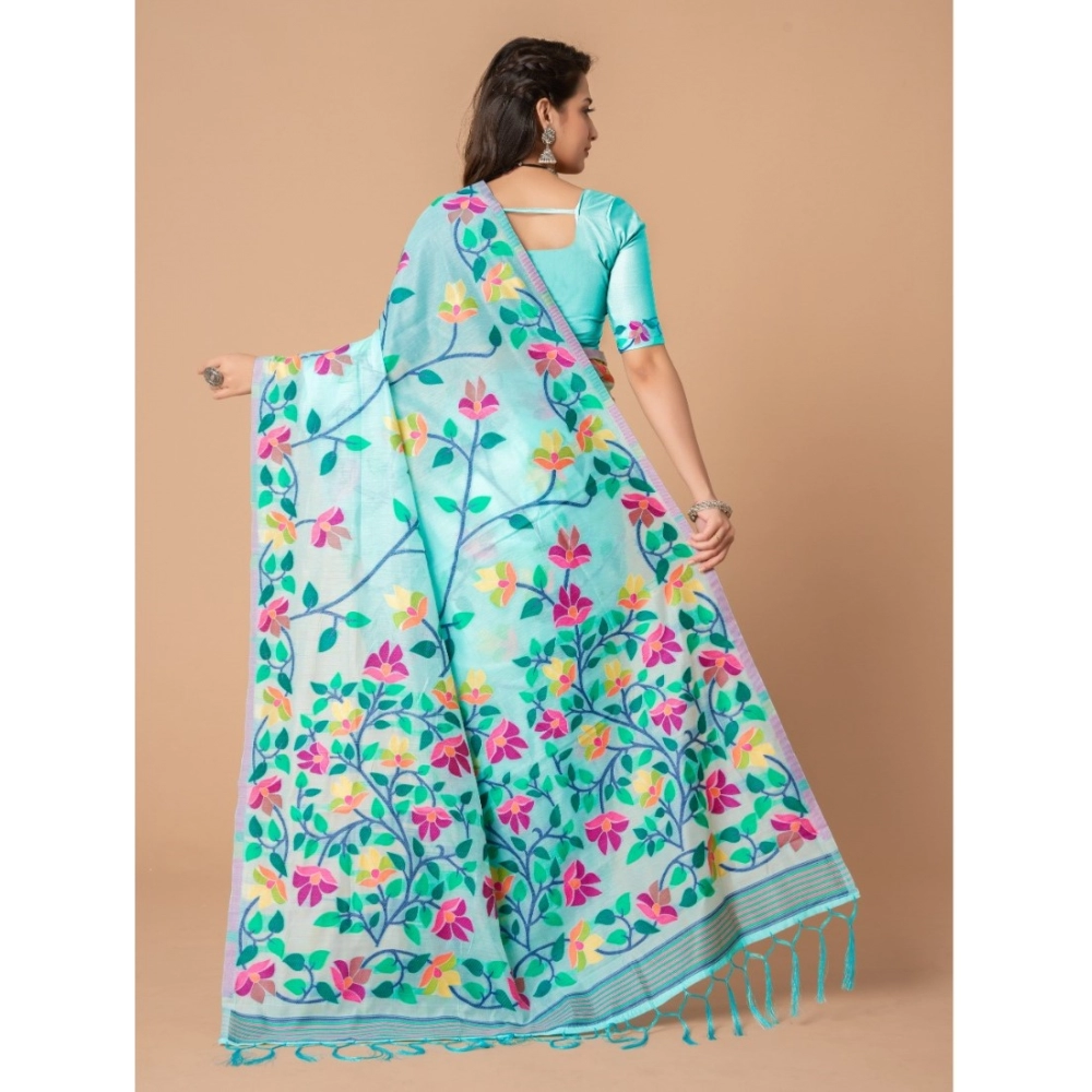 Generic Women’s Cotton Printed Saree With Unstitched Blouse (Sky Blue, 5-6 Mtrs)