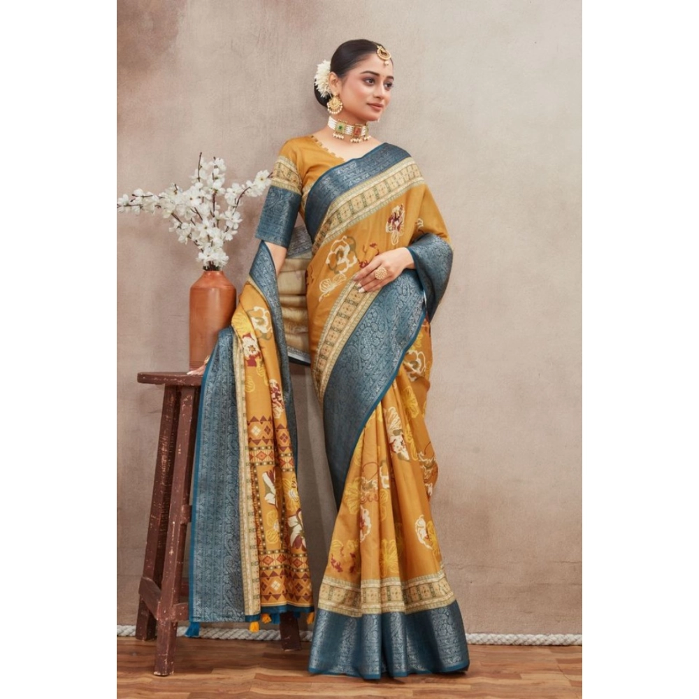Women’s Crepe Silk Printed Saree With Unstitched Blouse Color: Mustard, Material: Crepe Silk Pattern: Printed Blouse Type: Unstitched Blouse Disclaimer: The color of actual product may vary slightly from the images provided due to photographic lighting conditions and difference in screen resolutions.