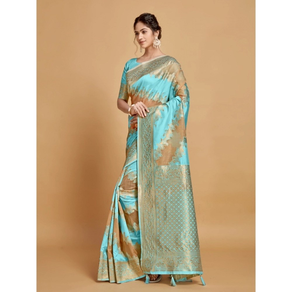 Generic Women’s Linen Printed Saree With Unstitched Blouse (Sky Blue, 5-6 Mtrs)